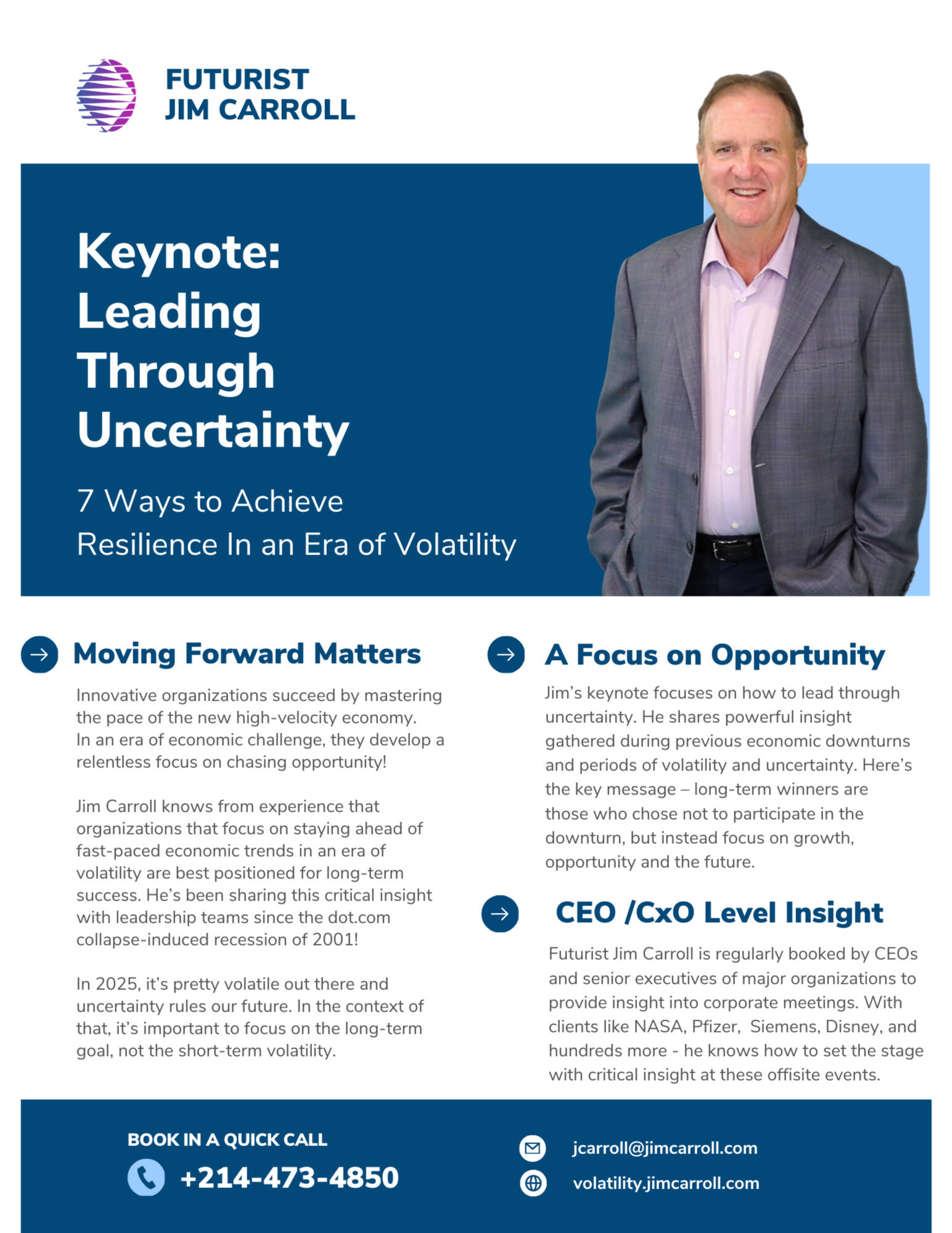 For 30+ years, Futurist Jim Carroll has been on a mission to help organizations understand how to align to tomorrow, today.Jim Carroll is the futurist that CEOs trust. His global client list demonstrates that they seek his accumulated 30 years of experience, wisdom, and insight, developed by the time he has spent with some of the leading organizations in the world.Jim’s leadership keynote will align you to your disruptive, accelerating future by providing detailed, specific industry trends. It’s powerful leadership insight delivered in a compelling and motivational style!You know you need to align to a world that is faster, more complex, and that demands resilience. You need deep insight into the trends that will impact you and the strategies that you can pursue to align with them. You need to inspire your leadership team and members to get moving. That’s how Jim Carroll will help you.Don’t just take Jim’s word for it. Join other leading organizations like NASA, Pfizer, The World Bank, Mercedes Benz, the PGA, Blackrock, the Wall Street Journal, and even Disney, all of whom arranged for Jim’s insight for a global leadership event or customer meeting – and came away empowered with new insight to take on our faster, more complex world.